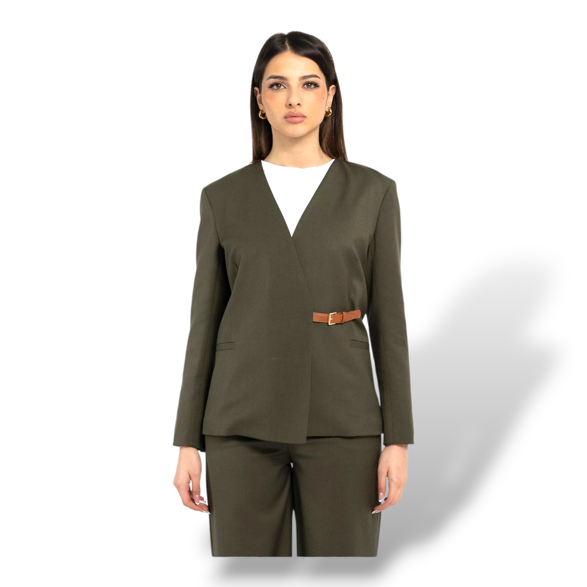 Giacca doppiopetto in flanella scollo a V, con frisi e fibbietta laterale in contrasto.