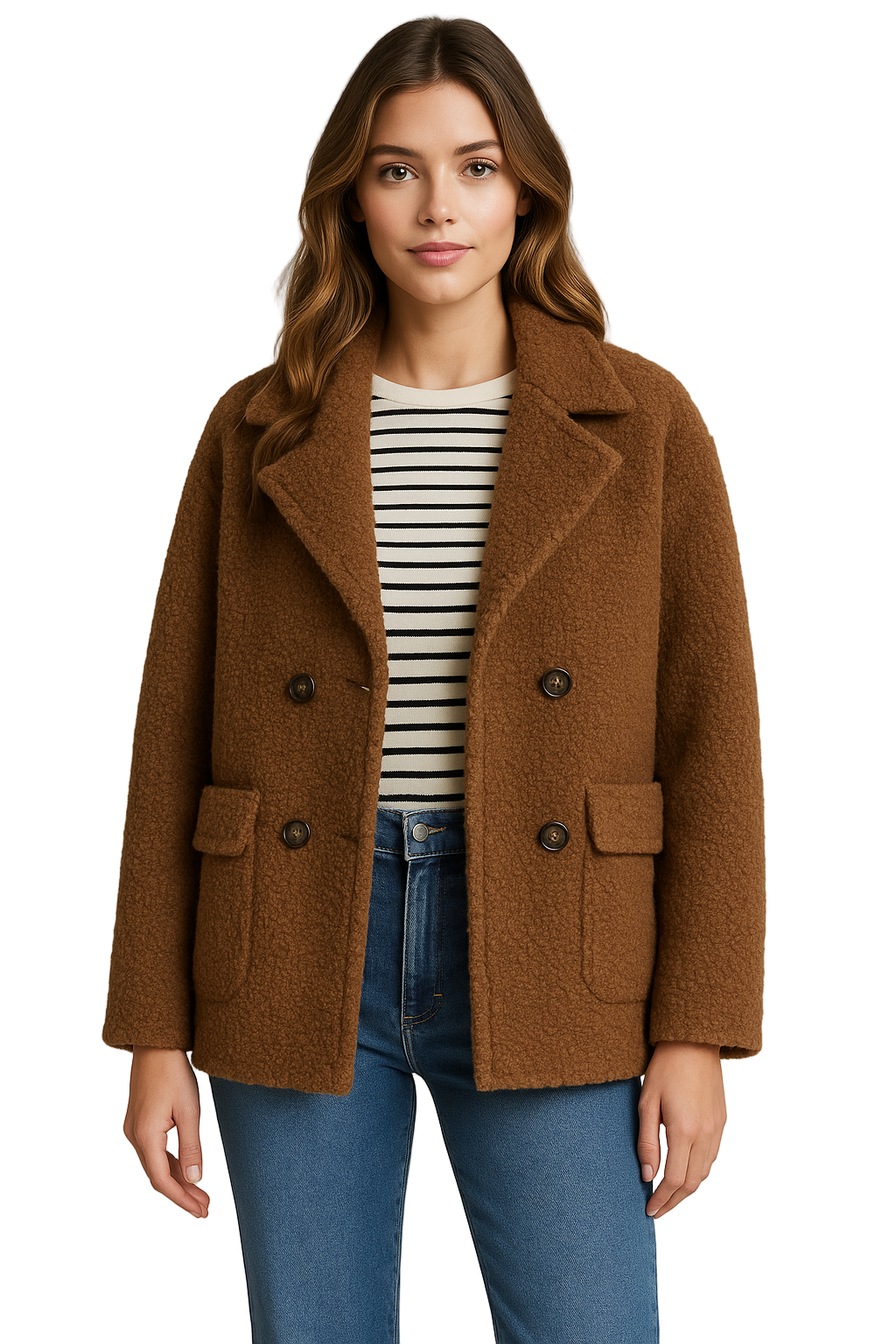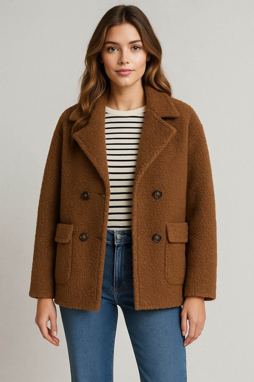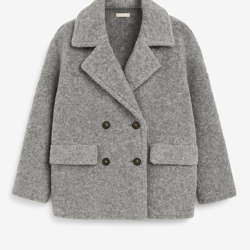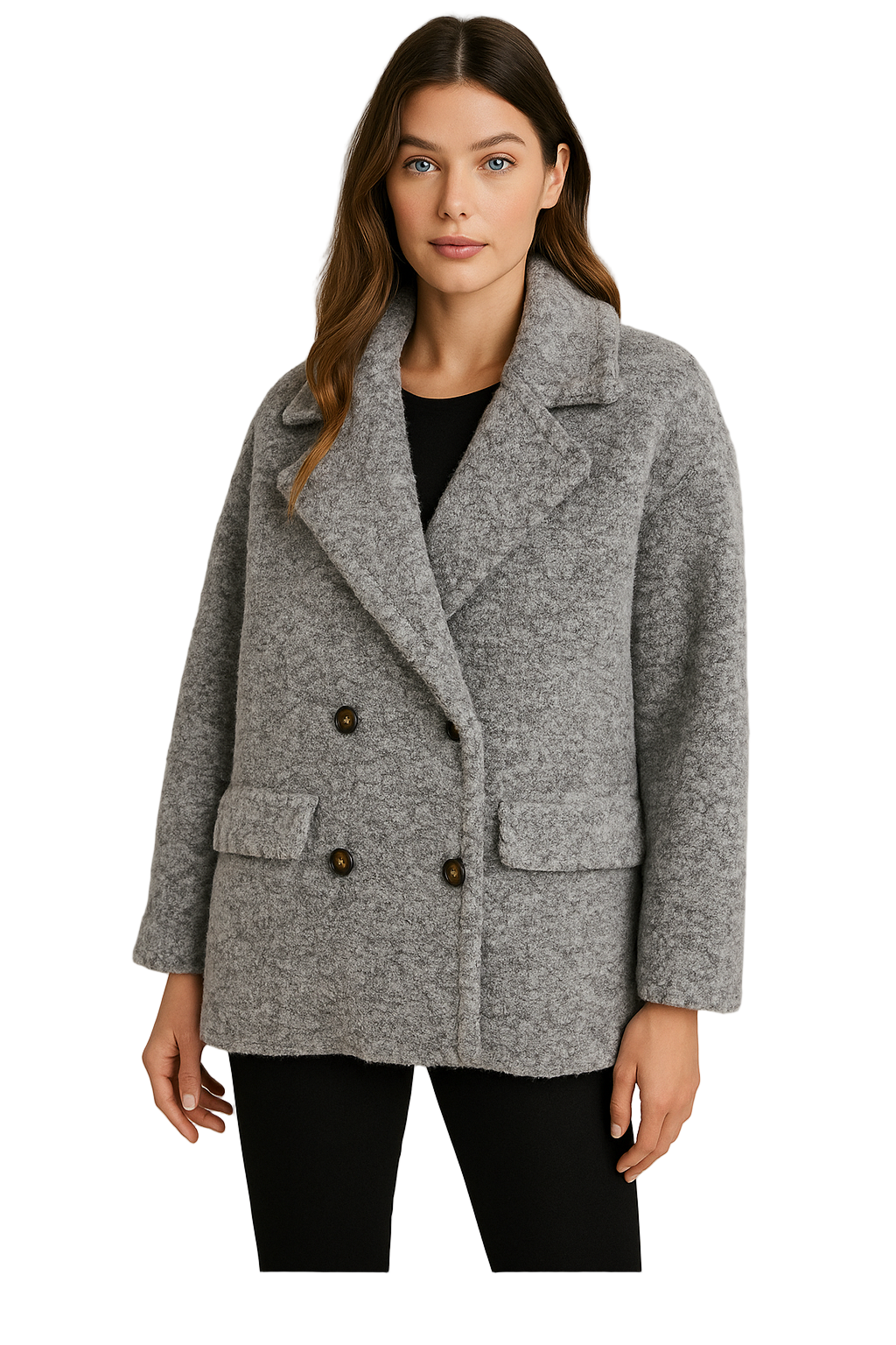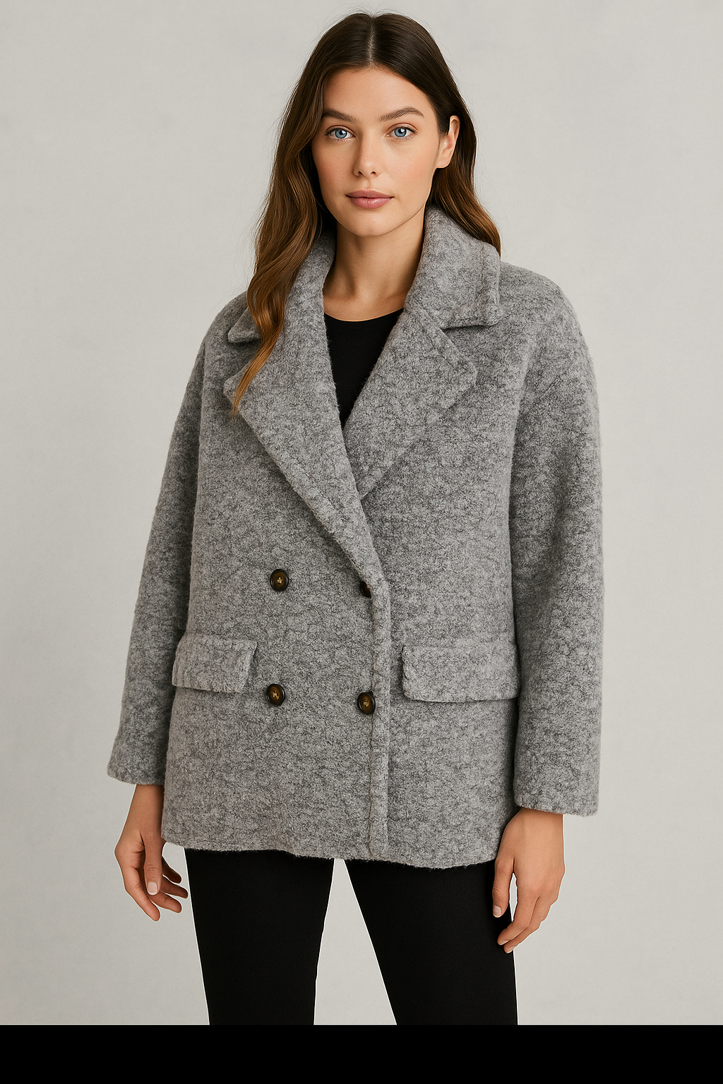 Morbido, avvolgente e chic senza sforzo. Questo cappotto effetto teddy in sfumatura grigio mélange è il capo perfetto per affrontare l’inverno con stile. Il taglio doppiopetto con revers ampio e bottoni effetto corno dona una linea elegante ma moderna, mentre le tasche frontali lo rendono pratico e confortevole.